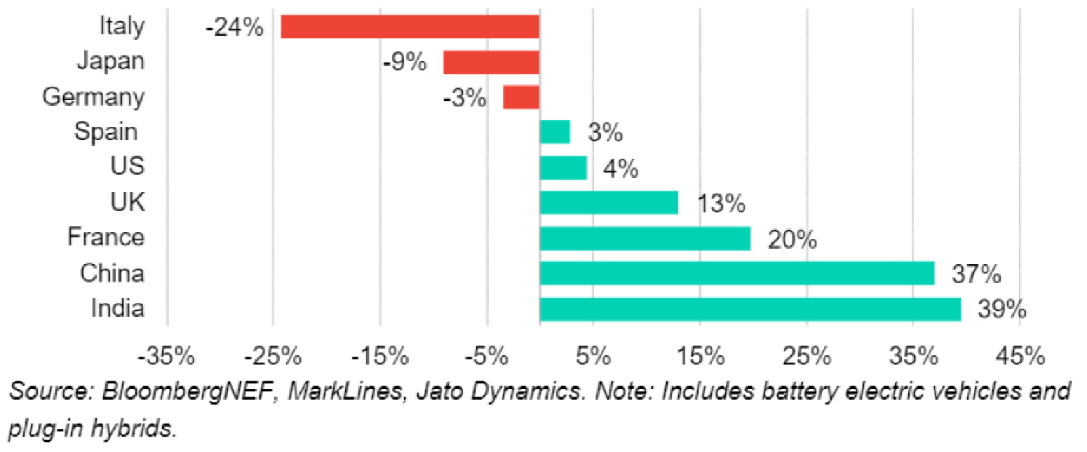 รูปที่ 2 การเปลี่ยนแปลงยอดขายรถยนต์ EV ส่วนบุคคลสำหรับปี 2024 เทียบกับ 2023 (ข้อมูล ณ Q1/2024) (ที่มา BloombergNEF)