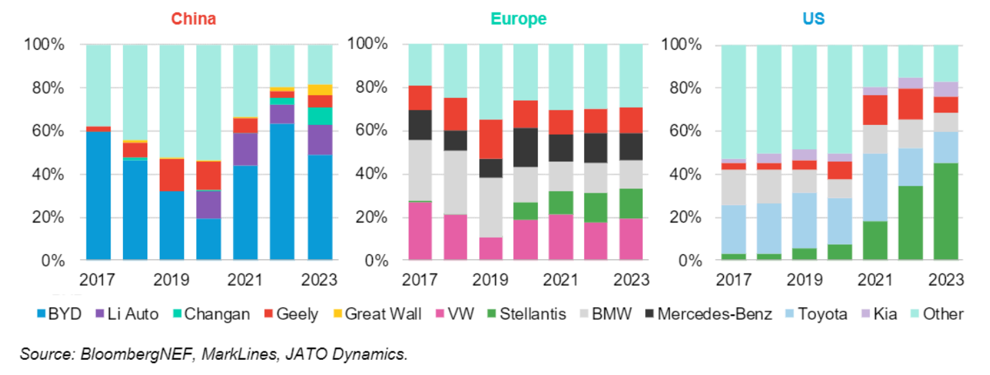 รูปที่ 6 ยอดขายรถยนต์ประเภท PHEV ของผู้ผลิตแต่ละรายในช่วงปี 2017-2023 ในประเทศจีน กลุ่มสหภาพยุโรป สหรัฐอเมริกา (ที่มา BloombergNEF)