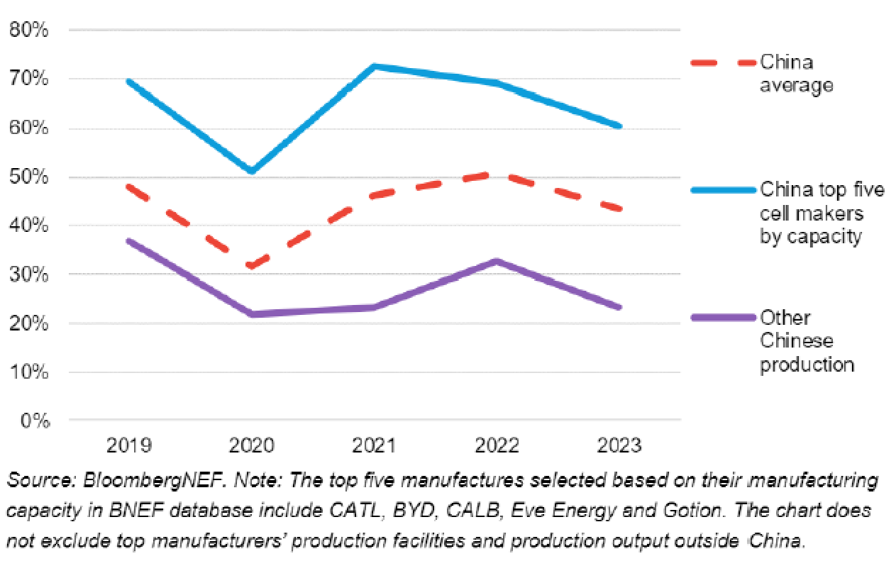 จากข้อมูล Bloomberg พบว่าอัตราการผลิต (Utilization Rate) ของ 5 ผู้ผลิตแบตเตอรี่รายใหญ่ของจีน (เช่น CATL, BYD เป็นต้น) ในปี 2023 อยู่ที่ระดับ 61% ในส่วนของค่าเฉลี่ยอัตราการผลิตแบตเตอรี่ของจีนอยู่ที่เพียงระดับ 45% เท่านั้น ซึ่งถือว่าทั้งผู้ผลิตระดับใหญ่และเล็กในจีนยังถือว่าไม่ได้เดินเครื่องผลิตเต็มกำลัง หรืออยู่ในภาวะกำลังการผลิตส่วนเกิน (Overcapacity) เนื่องจากอัตราการผลิตที่ต่ำกว่า 70% ทั่วประเทศจีน ส่งผลให้ราคาแบตเตอรี่ลดต่ำลง