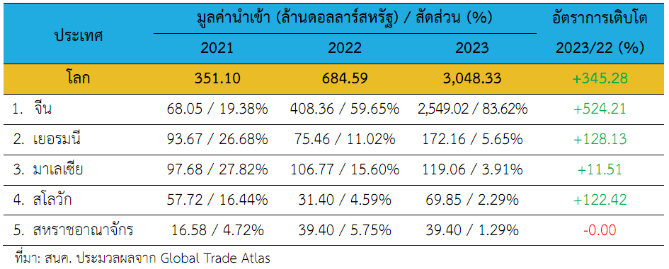 การนำเข้ายานยนต์ไฟฟ้าประเภท Plug-in (BEV และ PHEV) มีการเติบโตต่อเนื่อง โดยในปี 2023 มูลค่าการนำเข้ายานยนต์ไฟฟ้ามีการเติบโตร้อยละ 345.28 และมูลค่าการนำเข้าชิ้นส่วนยานยนต์ไฟฟ้าหดตัวร้อยละ 3.56 โดยมีคู่ค้าที่สำคัญคือจีน ซึ่งมีสัดส่วนการนำเข้าเชิงมูลค่าที่ร้อยละ 83.62 และมีการเติบโตร้อยละ 524.21