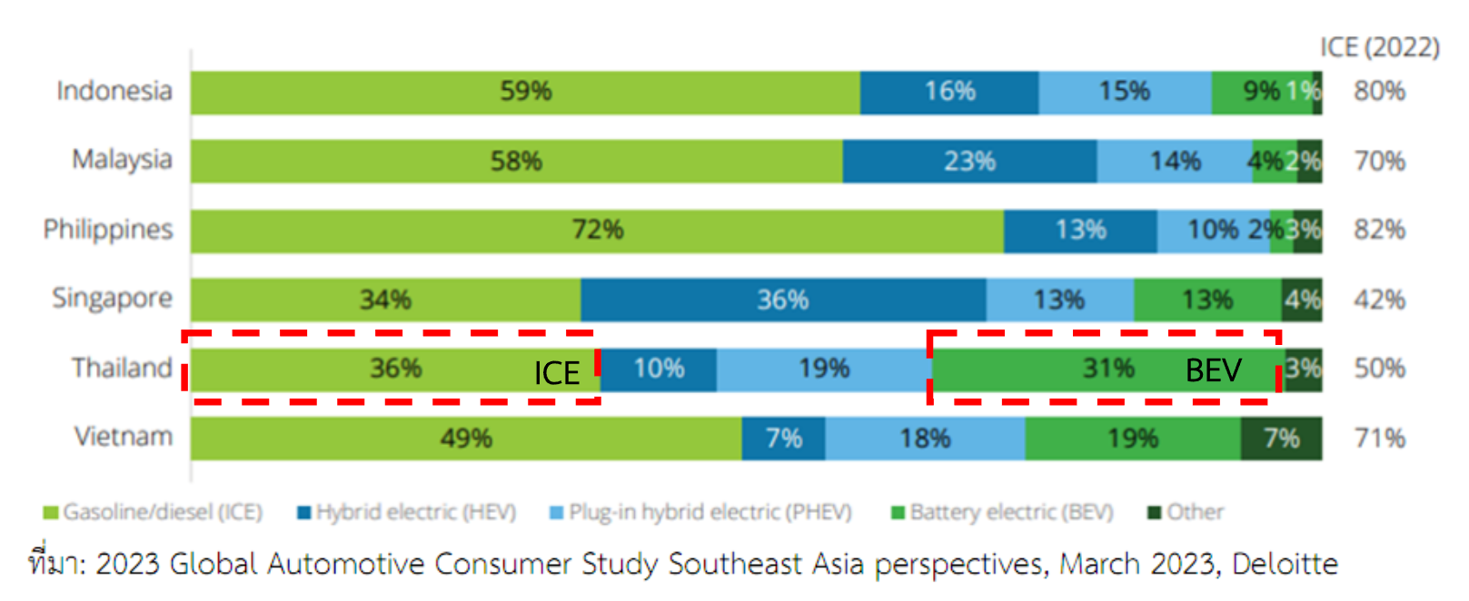 - ในปัจจุบัน ความสนใจในยานยนต์ไฟฟ้าได้เพิ่มขึ้นอย่างรวดเร็ว โดยไทยเป็นประเทศเดียวในภูมิภาคอาเซียนที่มีความสนใจในยานยนต์ไฟฟ้า BEV สูงกว่ายานยนต์ไฟฟ้าประเภทอื่น จึงเป็นโอกาสที่สำคัญของผู้ผลิตยานยนต์ไฟฟ้าจากต่างประเทศที่จะลงทุนขยายการผลิตในประเทศ