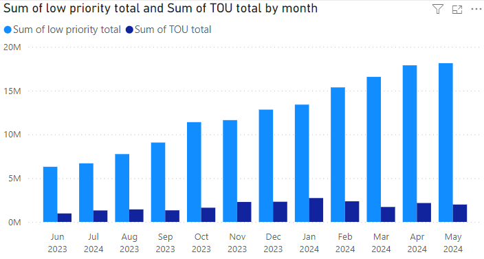 รูปที่ 40 หน่วยจำหน่ายไฟฟ้าของทั้ง กฟภ. และ กฟน. แบบ Low Priority เทียบกับแบบ TOU ในช่วงปี 2023 (มิถุนายน) – 2024 (พฤษภาคม)